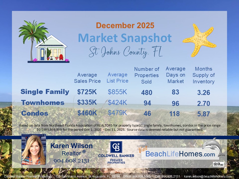 “My wife and I were thinking of selling our Townhouse in St. Augustine, and a friend recommended that we talk to Karen Wilson at Coldwell Banker before deciding on a realtor. With our primary residence out-of-state, we knew we’d be remotely closing on the sale, and therefore depending a lot on our realtor to keep things organized and moving on schedule. After an excellent first meeting, we signed up with Karen. She kept us up-to-date during every stage of the process and was very knowledgeable and professional while interacting with buyers and their realtors, the HOA, the title company, the inspection company, and all the others that need to be involved for a successful sale. I’m pleased to say she not only met our expectations, she exceeded them.” ~ Diane and Garry